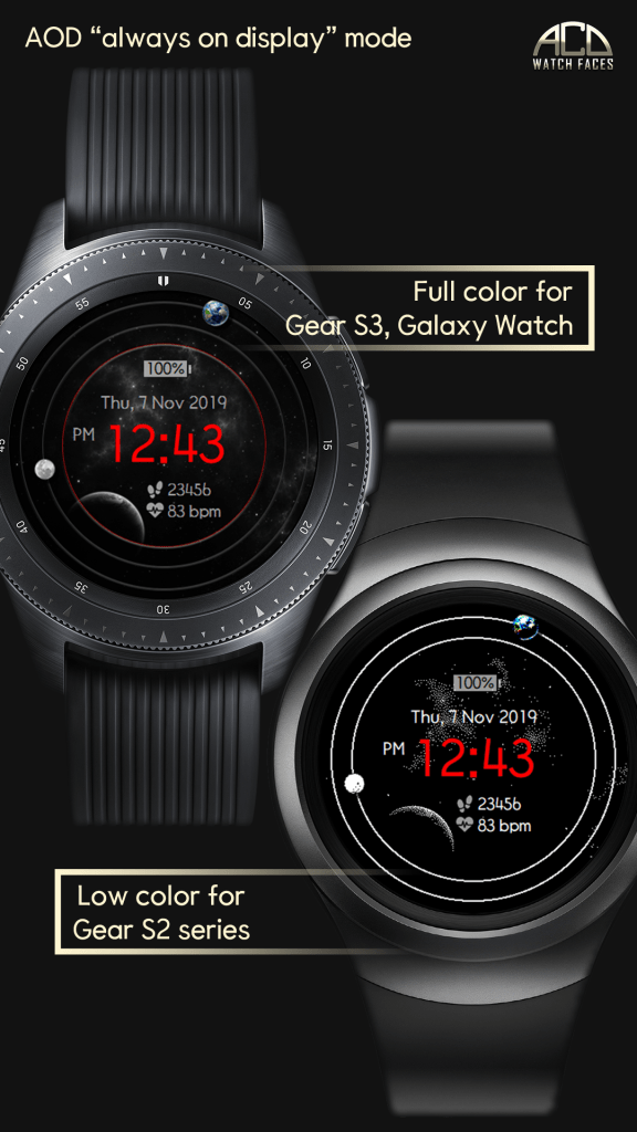 Hybrid watch face with beautiful galaxy background and orbiting planets around the dial.