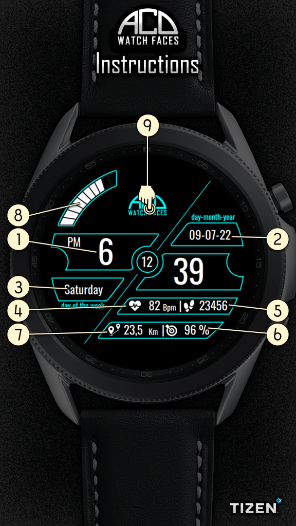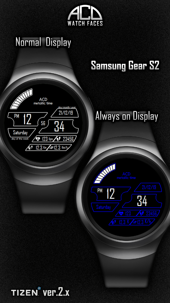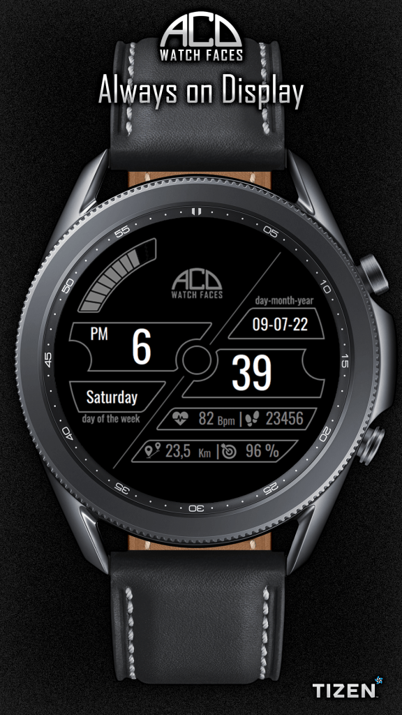 A simple and battery-efficient design used in always-on display modes from the “ACD Metallic Time” collection. The model has between 6% and 10% pixel lumination that helps slow battery consumption. Colors can be changed by double-tapping on the screen.