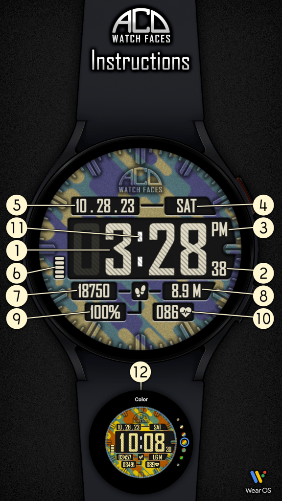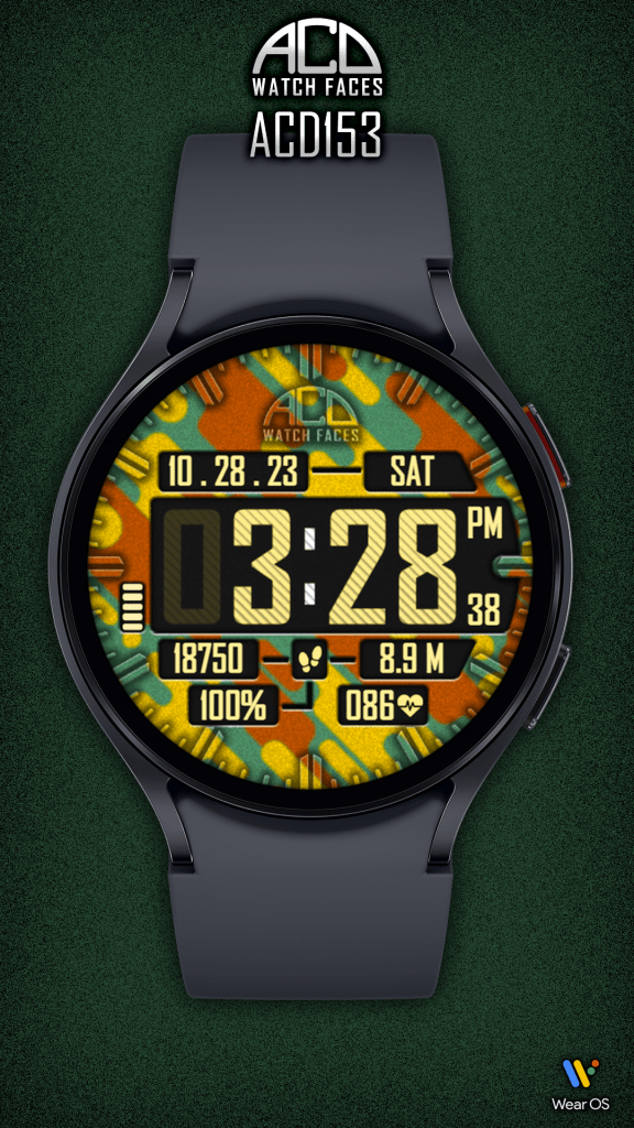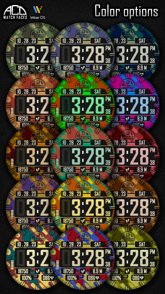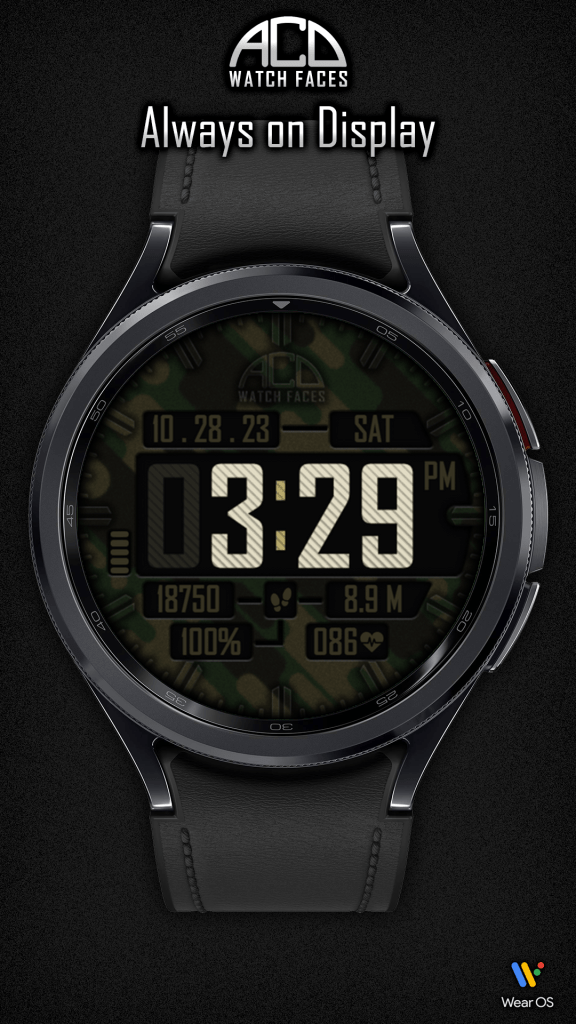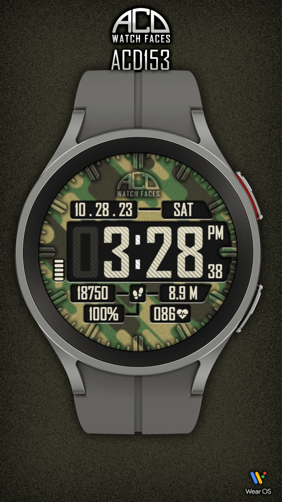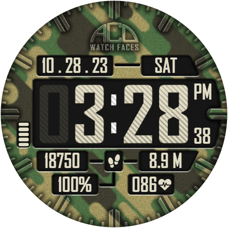 Military-themed Wear OS watch face with camouflage patterns. Big digital time with 30 camouflage colors.