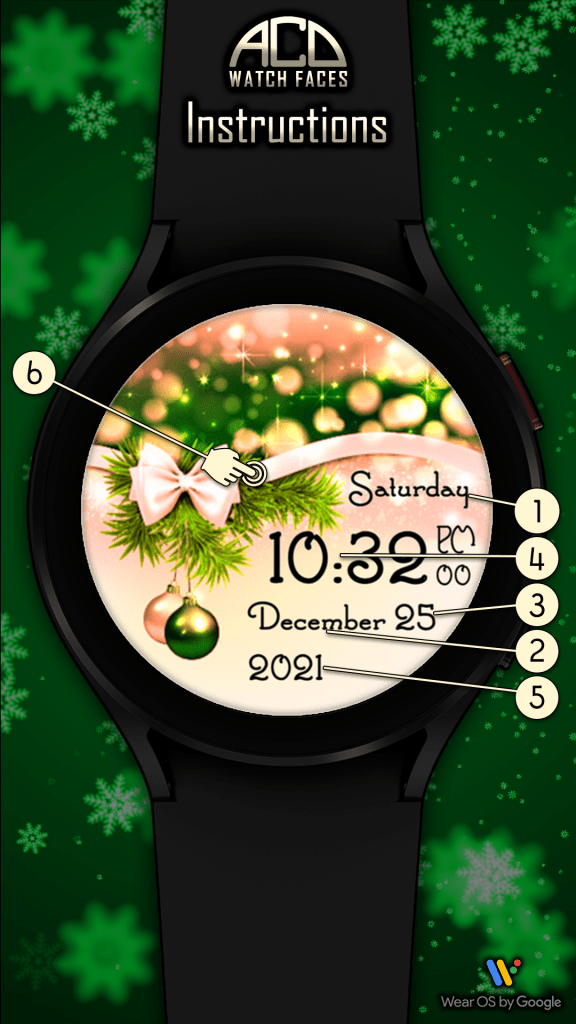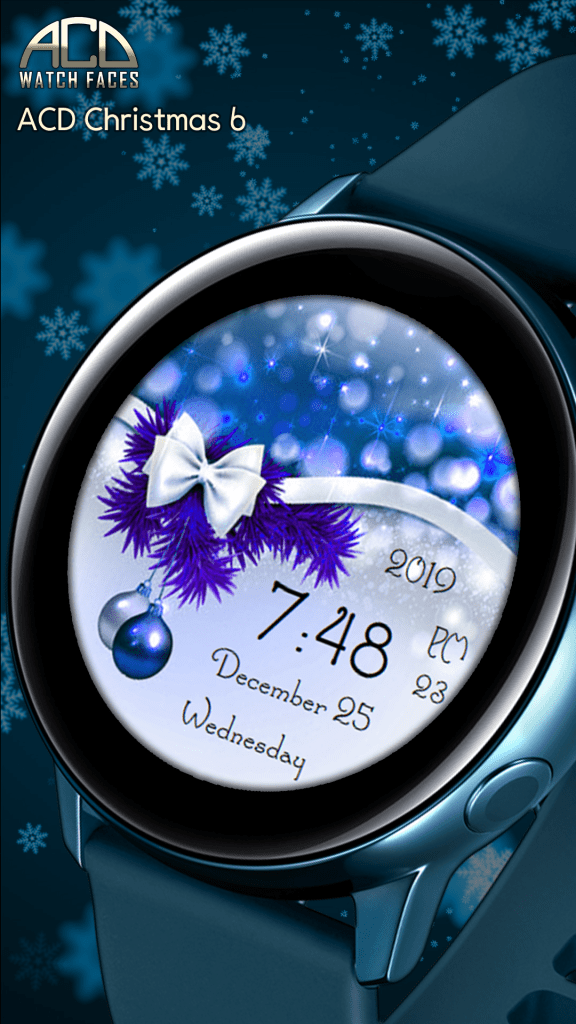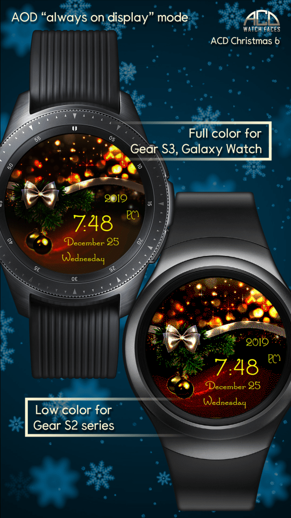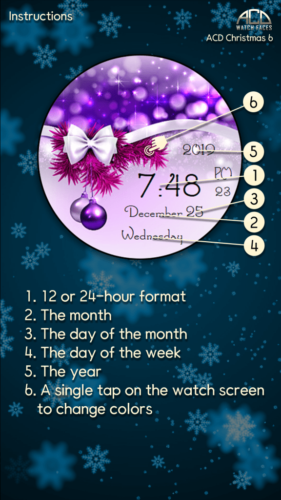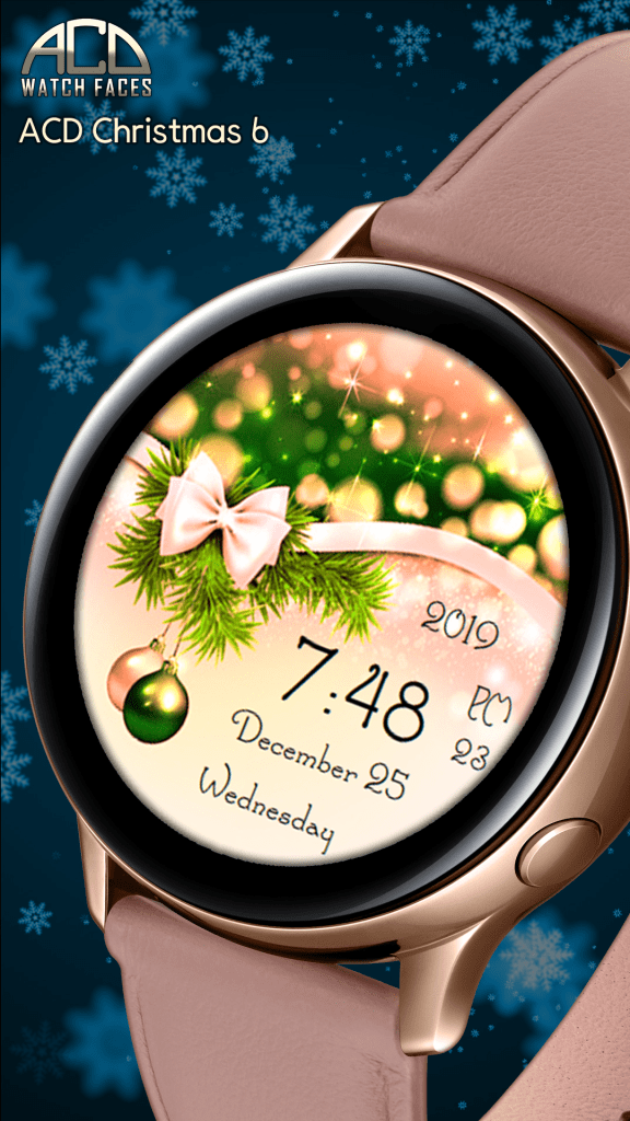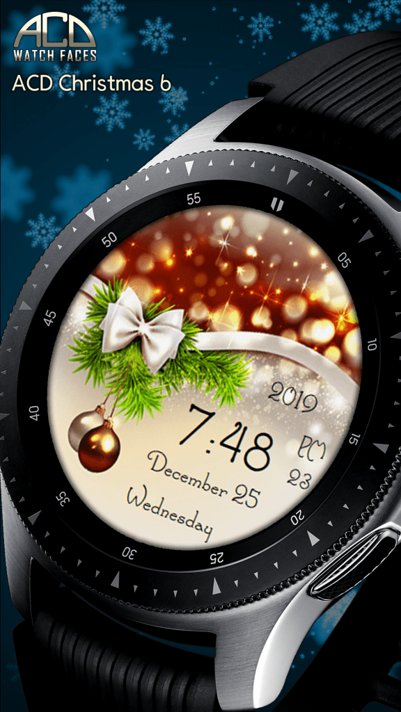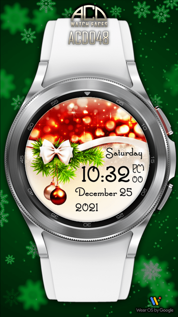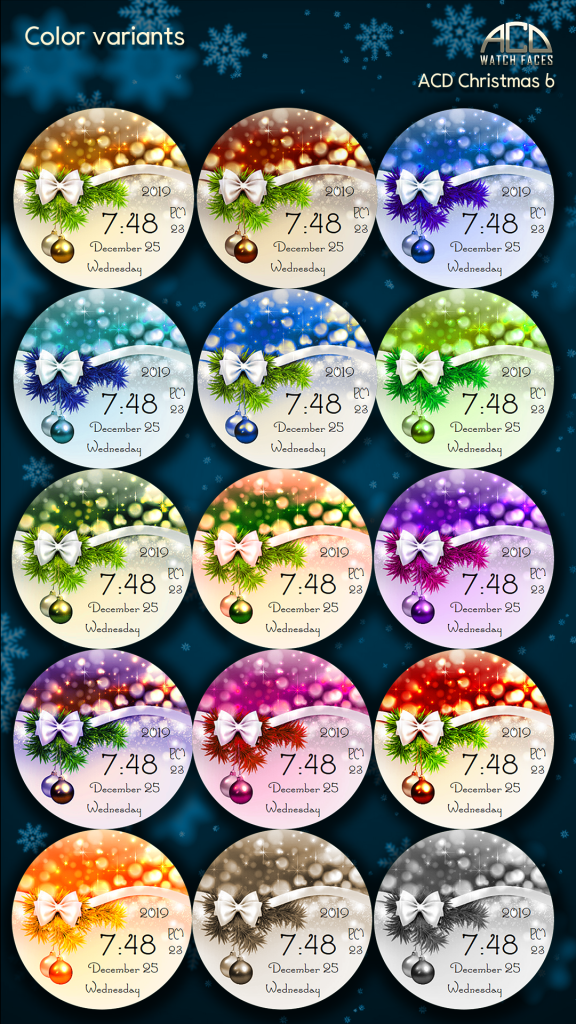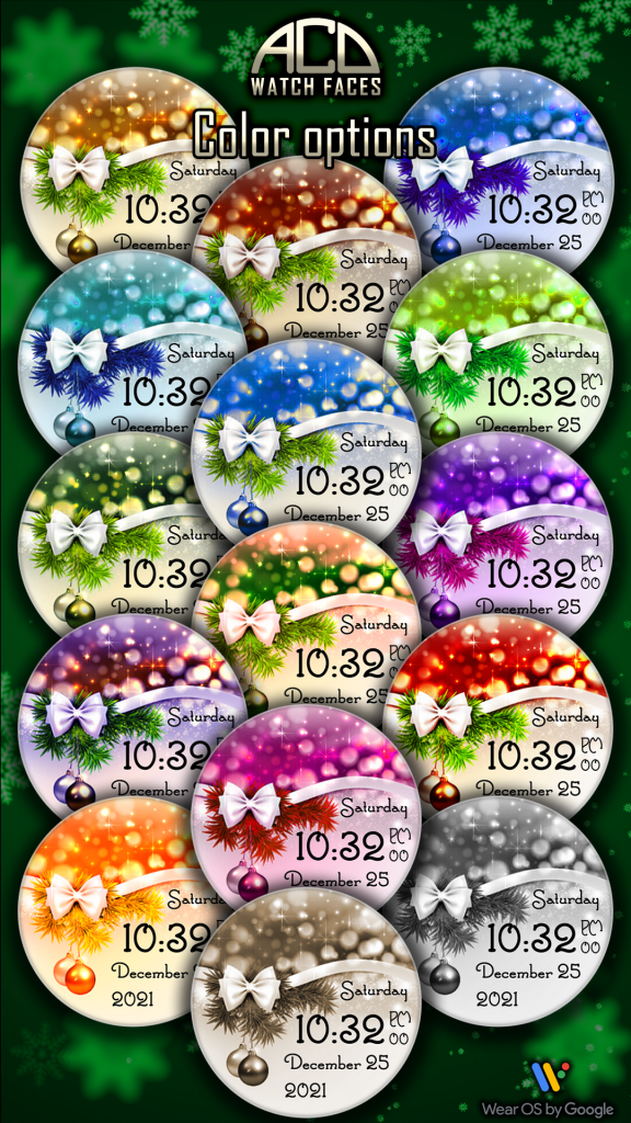 Christmas watch face with 15 color options changeable by a single touch on the screen.