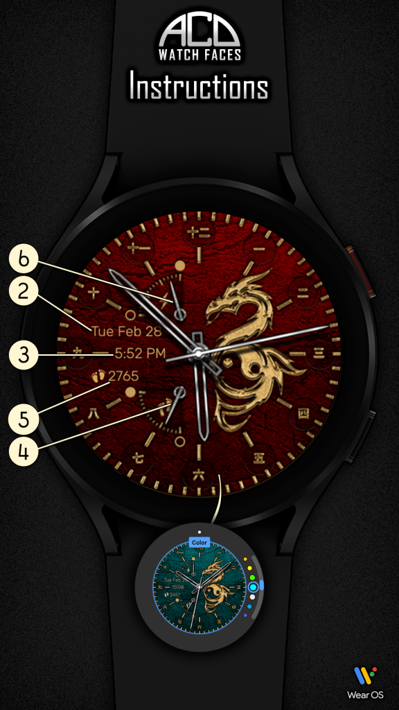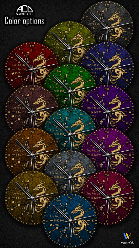 - 13 colored backgrounds that can be changed from Customize menu of the watch face