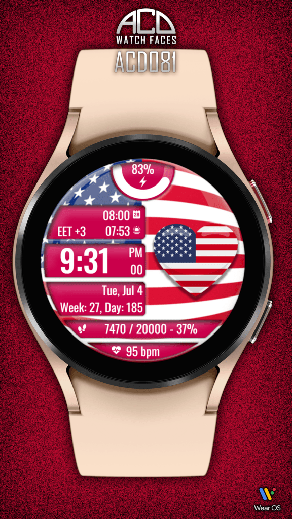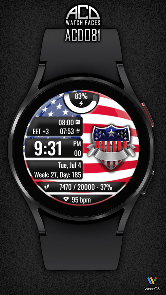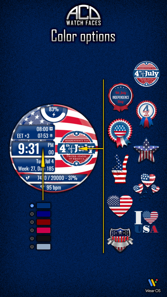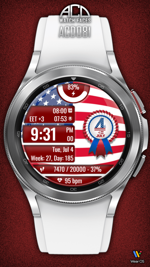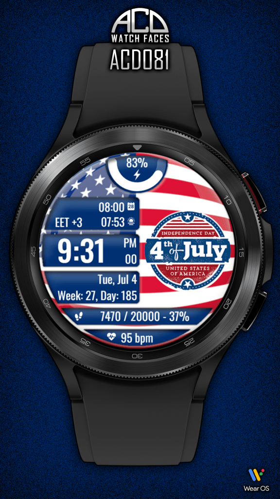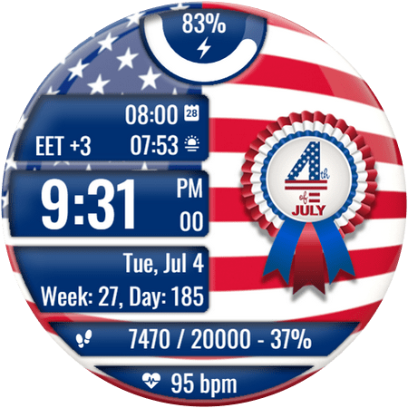 Digital Wear OS watch face with 4th of July holiday-themed badges/logos. Specially created for the Independence Day celebration but can also be worn on any other day. A patriotic watch face that should not be missing from your collection.