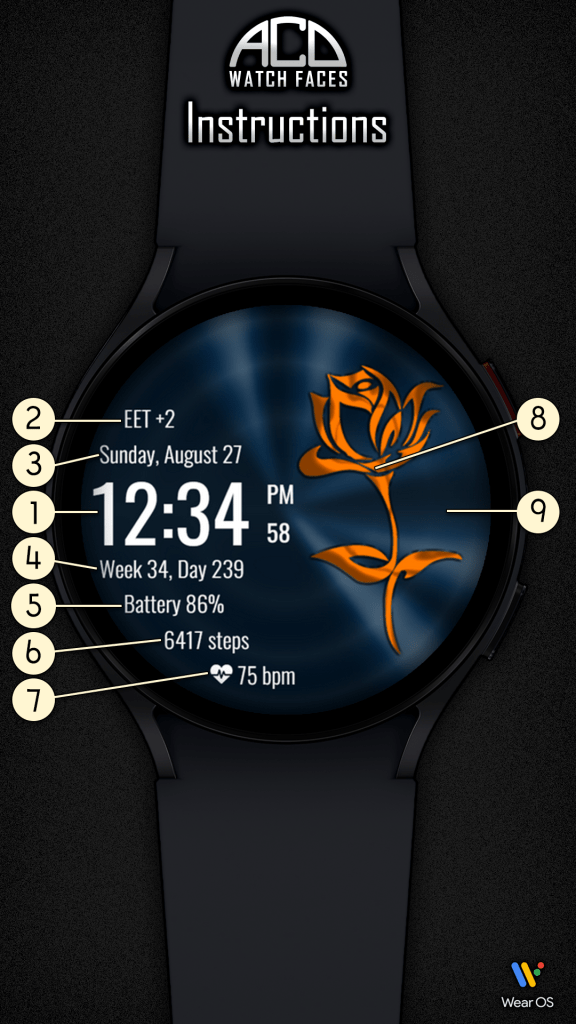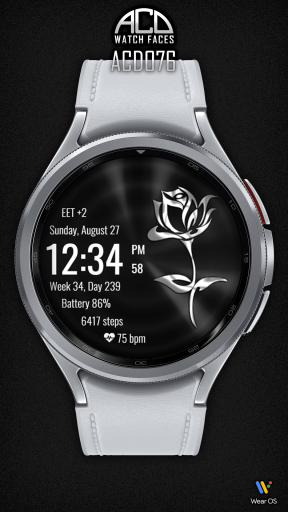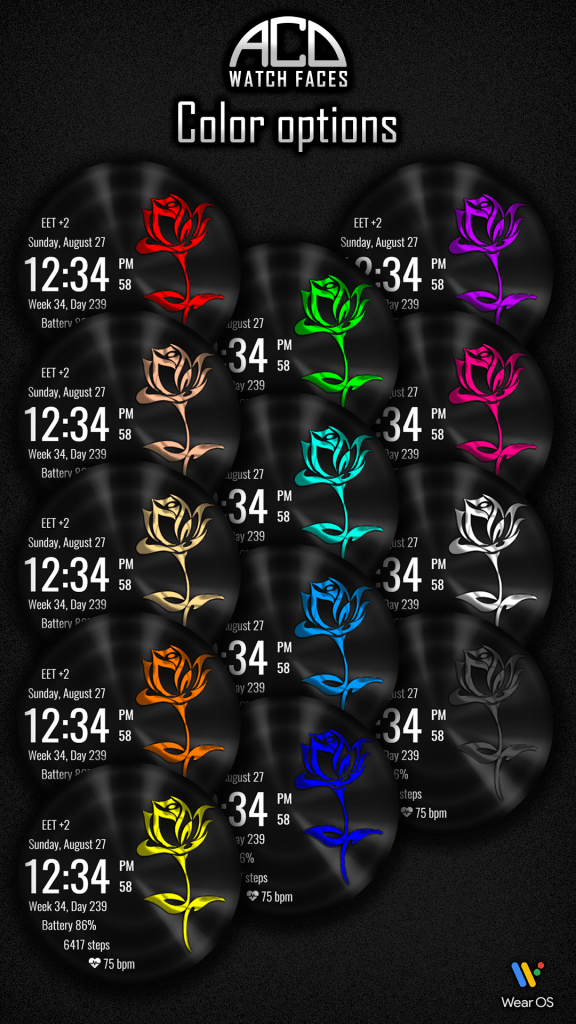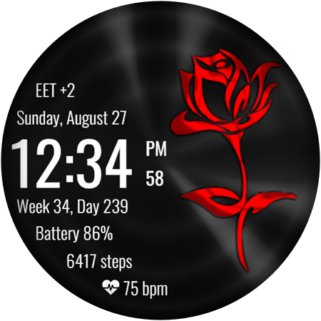 Wear OS digital watch face with a stylish rose. You can change the rose and the background colors from the customized menu of the watch face.