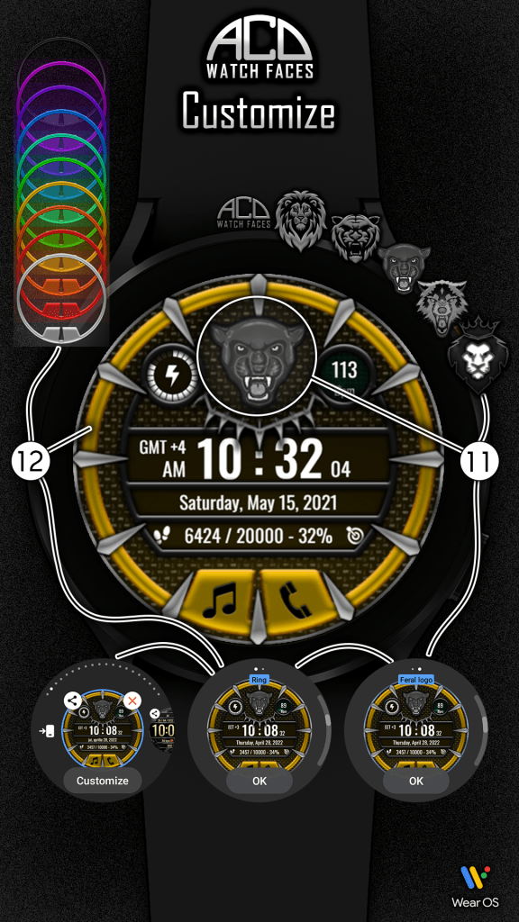 - Ring with 10 colors (change them in the Customize menu on the watch or your watch app on the mobile)